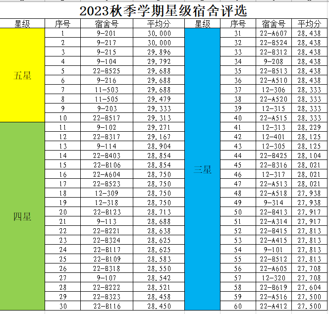 本次“星级宿舍”评比活动成员由公司党总支副书记、各辅导员和院员工会宿管部组成,评比由院员工会宿管部对本学期各宿舍第一周至第十三周宿舍内务得分加权汇总,秉持“公平、公正、公开”的原则,从宿舍卫生、宿舍文化、宿舍内务等方面进行评选。在评比过程中,各宿舍积极参与,展现出干净整洁、空气清新、舒适温馨、宁静和谐的宿舍居住环境,展现了公司学子严于律己的作风态度和对校园生活的热爱。最终评选出五星级宿舍10个、四星级宿舍20个、三星级宿舍30个,并对其予以奖励表彰。