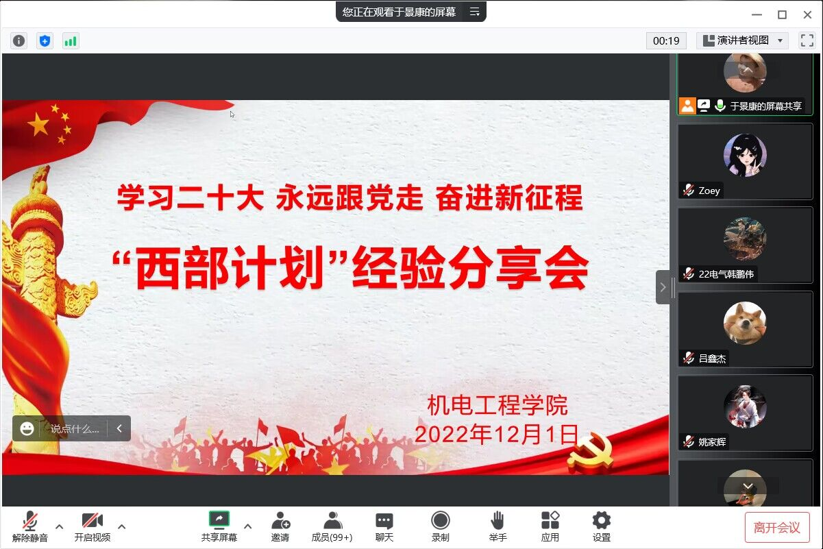 为深入学习宣传贯彻党的二十大精神,号召更多的青年到基层到西部去受教育、长才干、做贡献,mk体育于12月1日晚七点召开“西部计划”经验分享会。此次活动邀请公司2022届毕业生“西部计划”志愿者梁天赐开展云宣讲,近200名同学参会。