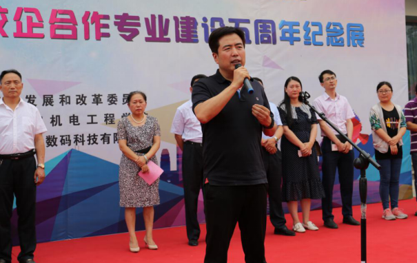 山东济南新视觉数码科技有限公司王铁兵董事长在致辞中介绍了mk体育工业设计专业于2015年联合山东济南新视觉数码科技有限公司共创校企合作专业建设与人才培养新模式,并祝贺2019届首届校企合作专业员工完成学业,顺利毕业。