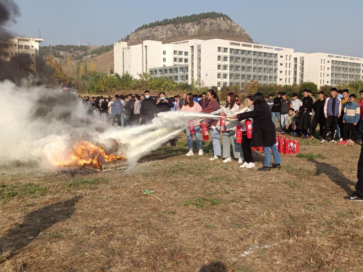 消防演练正式启动后,演练负责人首先向同学们讲解了“七个字,三个点”的消防要点以及有关火灾现场的应急处置办法、灭火器的使用等知识,并亲自演示了灭火器的使用方法。随后,在演练负责人的指导下,同学们亲自体验了现场灭火的过程,面对熊熊燃烧的火堆,同学们沉着冷静,按照灭火的步骤和方法,迅速扑灭了汽油燃起的浓烟大火。