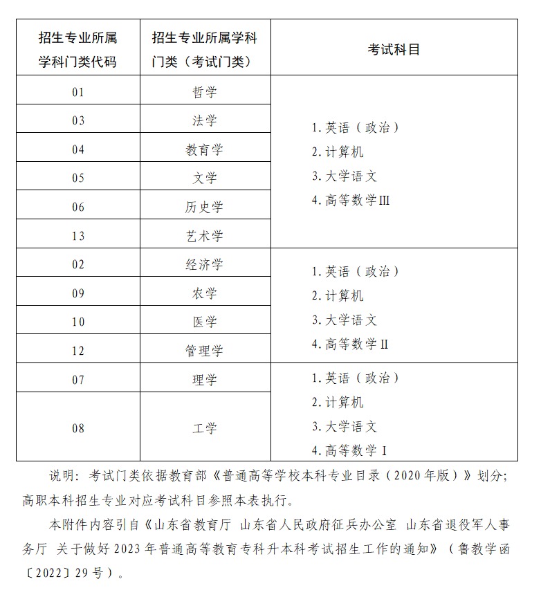 附件4:山东省2023年普通高校专升本专业类别设置及考试科目