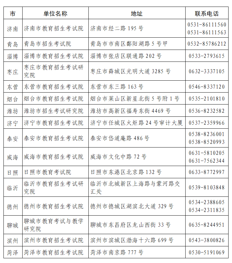 附件:山东省2024年普通高等教育专科升本科招生考试各市教育招生考试机构地址及联系方式