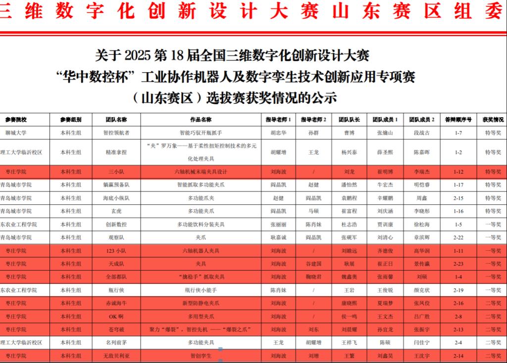 8月18日至8月19日,2025第18届全国3D大赛“华中数控杯”工业协作机器人及数字孪生技术创新应用专项赛全国总决赛在厦门理工公司举行。由公司mk体育的刘龙、崔明博、刘瞻远团队在历经省赛、国赛,从3000余支队伍中脱颖而出,斩获全国总决赛三等奖。同时公司mk体育学子在山东赛区中取得一个省级特等奖、三个省级一等奖、四个省级二等奖的优异成绩。